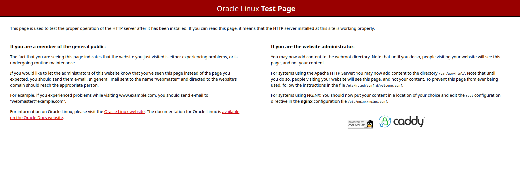 <!DOCTYPE html> <html> <head> <title>Caddy Web Server</title> </head> <body> <h1>Congratulations! Caddy Web Server Works on Oracle Linux 10</h1> </body> </html>