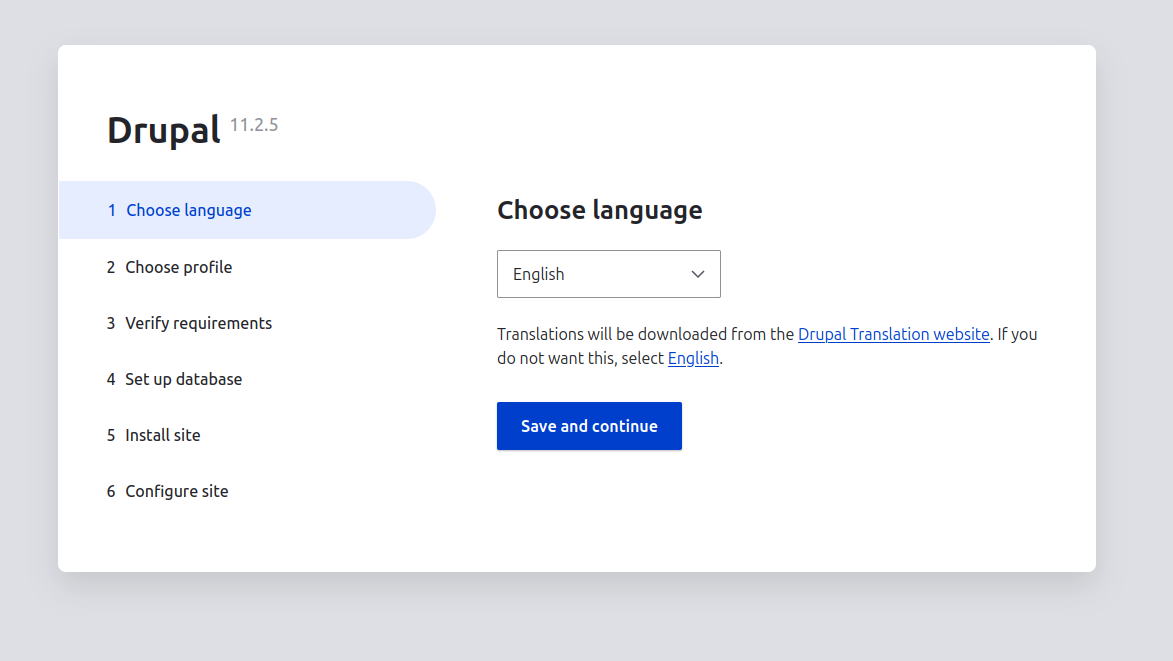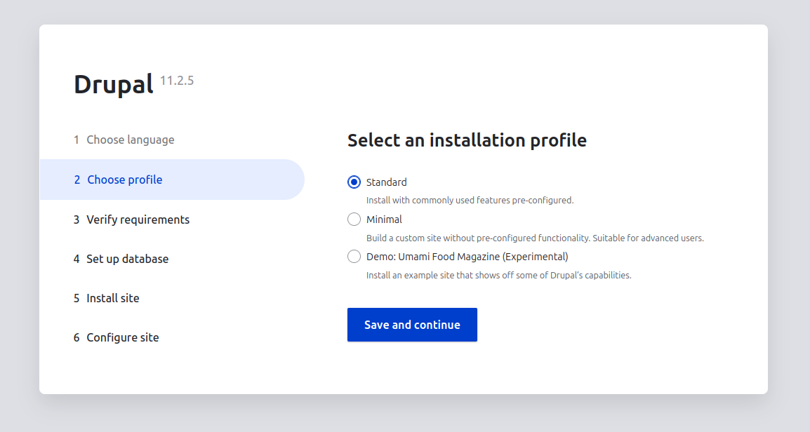 Select an installation type and click on the Save and continue button. You should see the following screen: