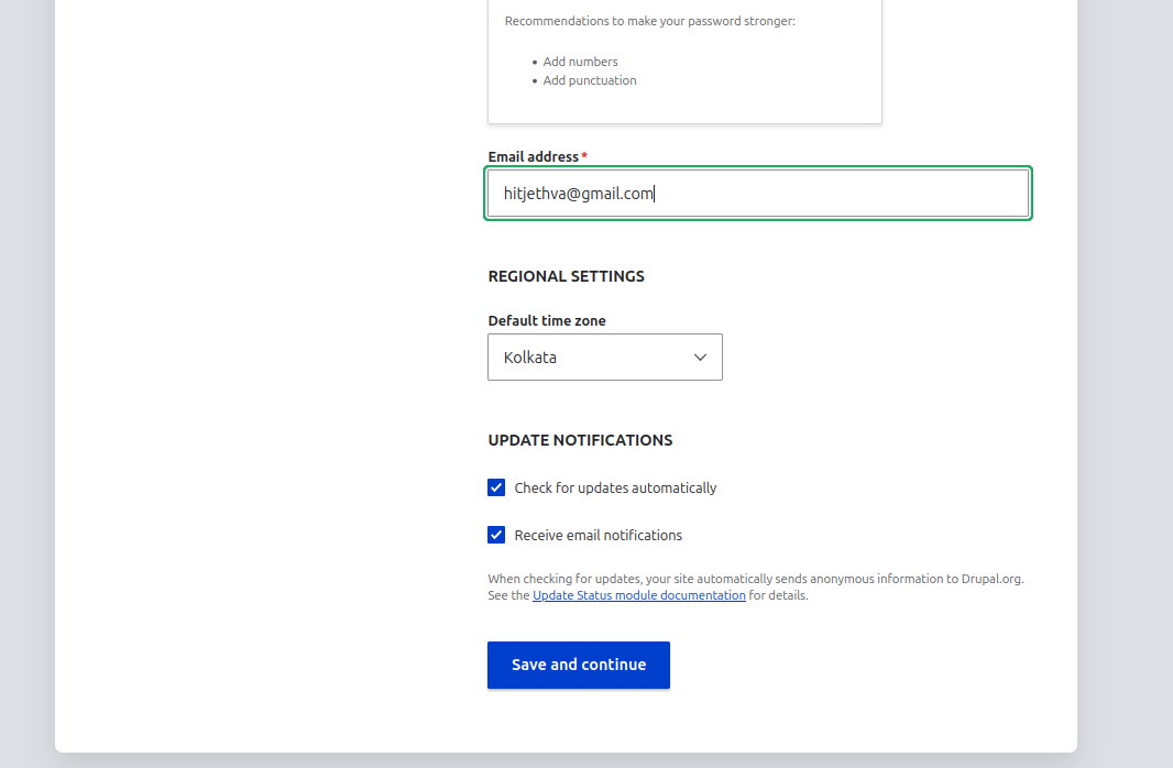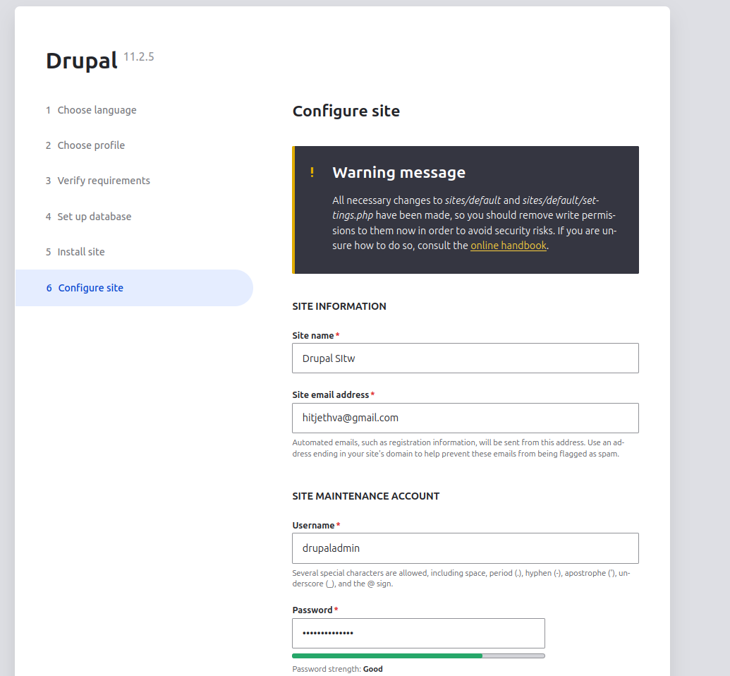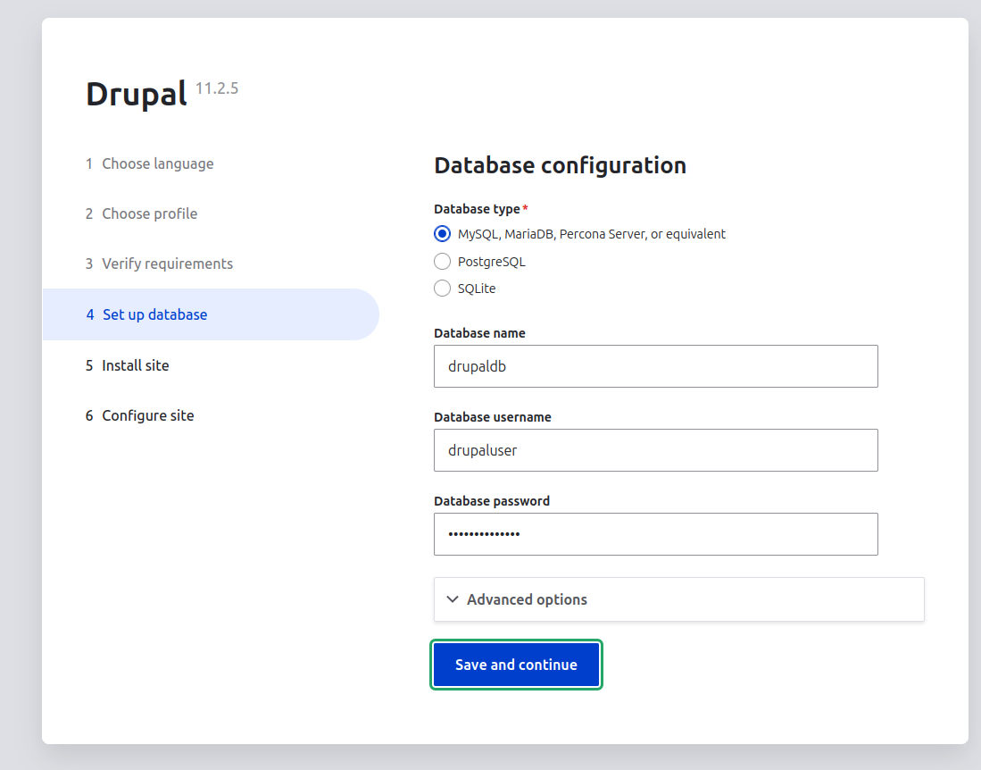 Provide your database information and click on the Save and continue button. You should see the Drupal site information on the following screen: