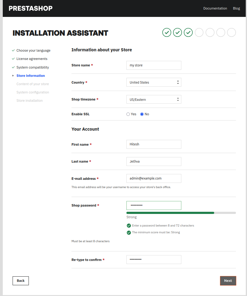 At this point, PrestaShop is installed and configured. Now, open your web browser and access the PrestaShop web UI using the URL http://prestashop.example.com. You should see the store information screen: