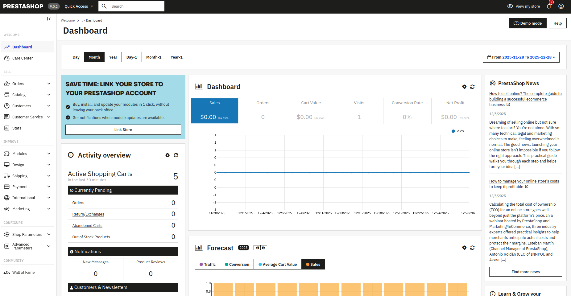PrestaShop is a free and open-source shopping cart system that allows you to quickly host your own online shop. It is written in the PHP programming language with support for the MySQL database management system. PrestaShop has over 300 functionalities, such as unlimited products with attributes, categories, multistore, many currencies, languages, payment, delivery methods, CMS, filtering, statistics, e-marketing, transactional e-mailing, and many more.