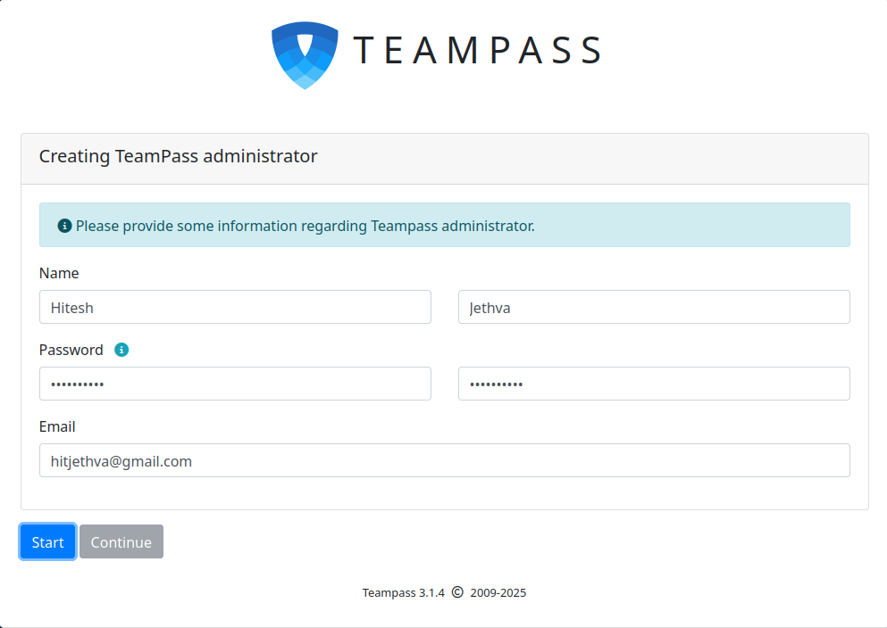 Click on the Start then Continue button. You should see the admin creation page: