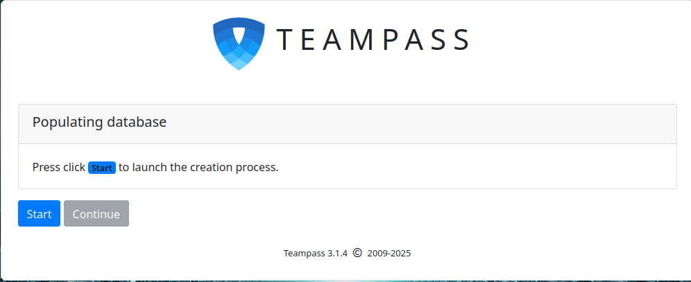 Click on the Start then Continue button. You should see the database population page: