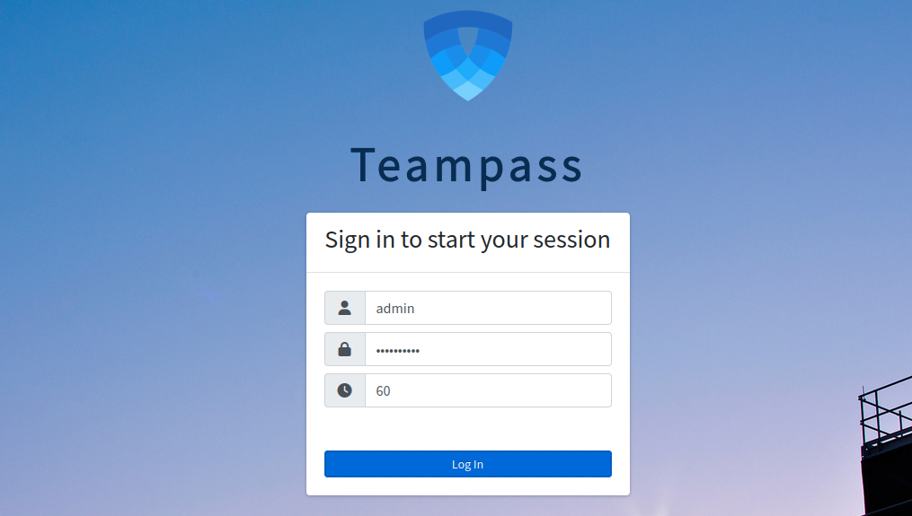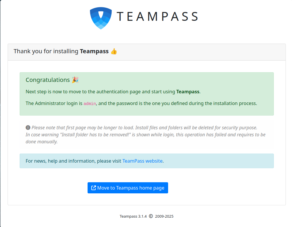 Click on the Move to home page. You should see the Teampass login page: