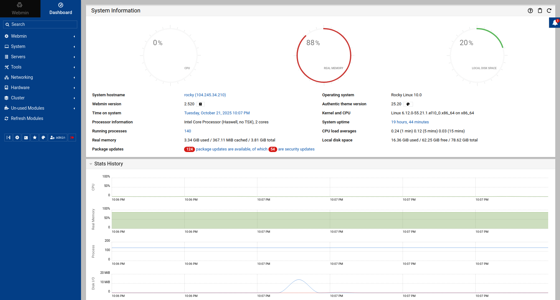 Provide your admin username and password and click on the Sign in button. You should see the Webmin dashboard on the following page: