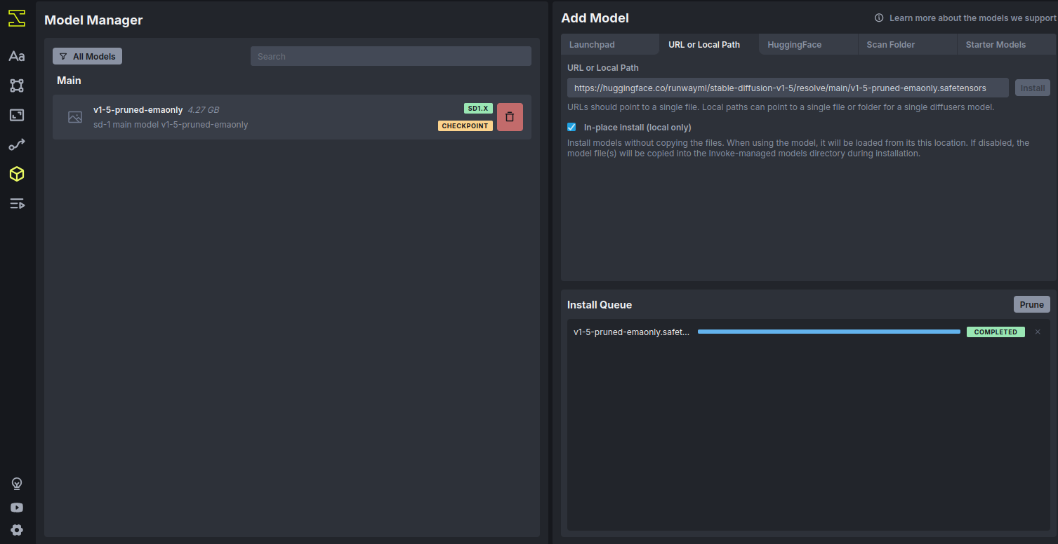2. Inside the InvokeAI WebUI, click on Model Manager from the sidebar. Click Add Model. In the URL or Local Path tab, paste the following model URL from Hugging Face: