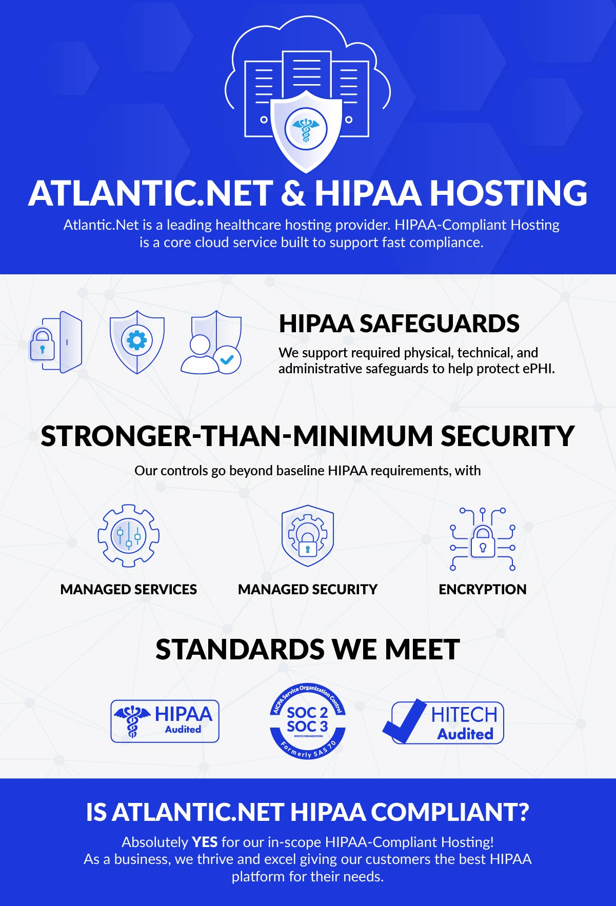 In reality, the checks and balances Atlantic.Net uphold far exceed the minimum requirements for HIPAA compliance. We always aim to go above and beyond to secure our healthcare clientsā cloud data. The company provides extensive managed services, managed security, and high-end encryption, and fully complies with SOC 2 and SOC3. Furthermore, Atlantic.Net is fully compliant and audited against the demanding HIPAA and HITECH standards.